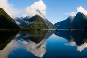 Southern Alps on the South Island and volcanic Mount Taranaki on the